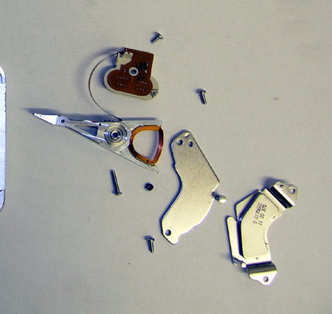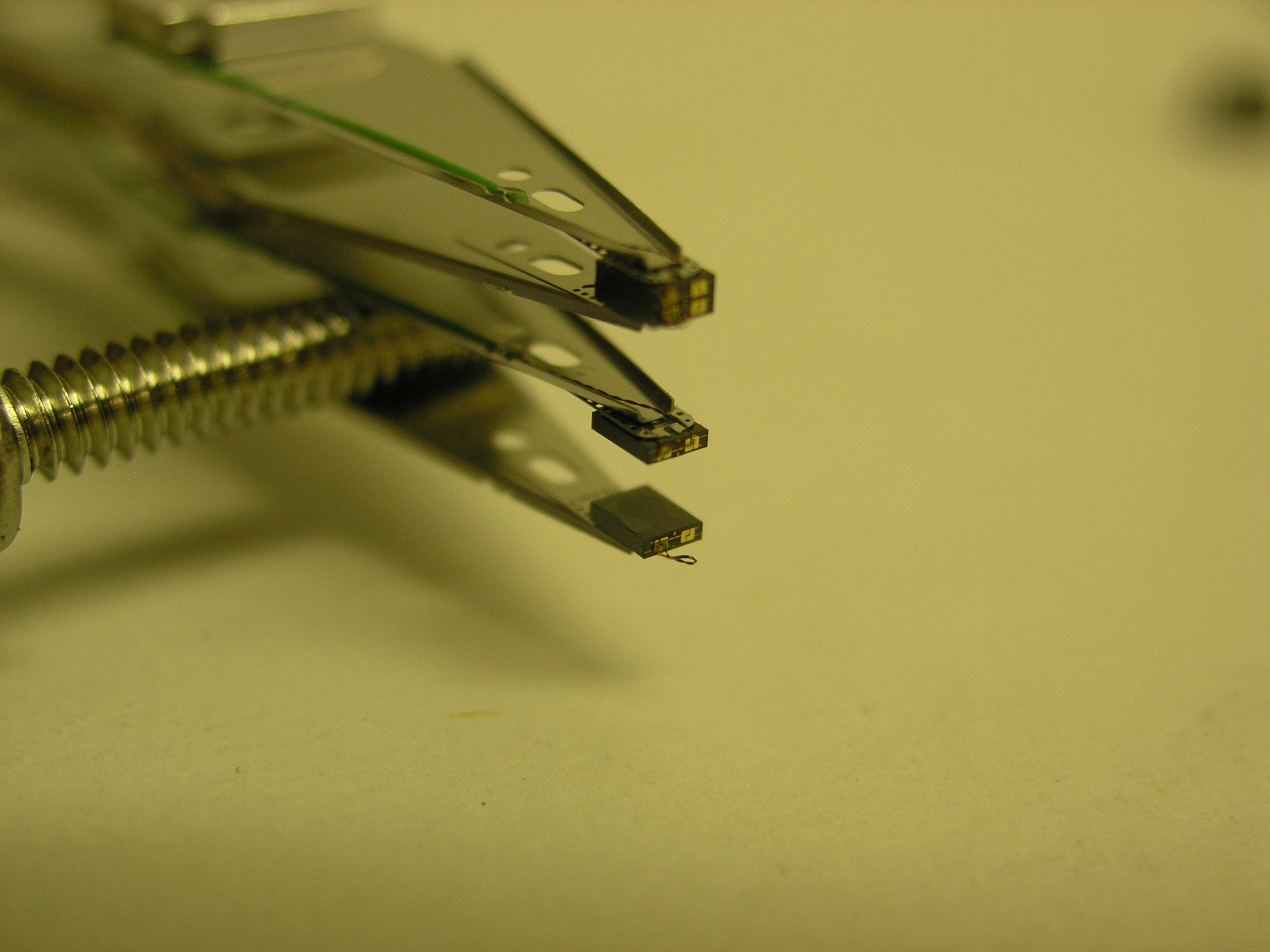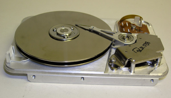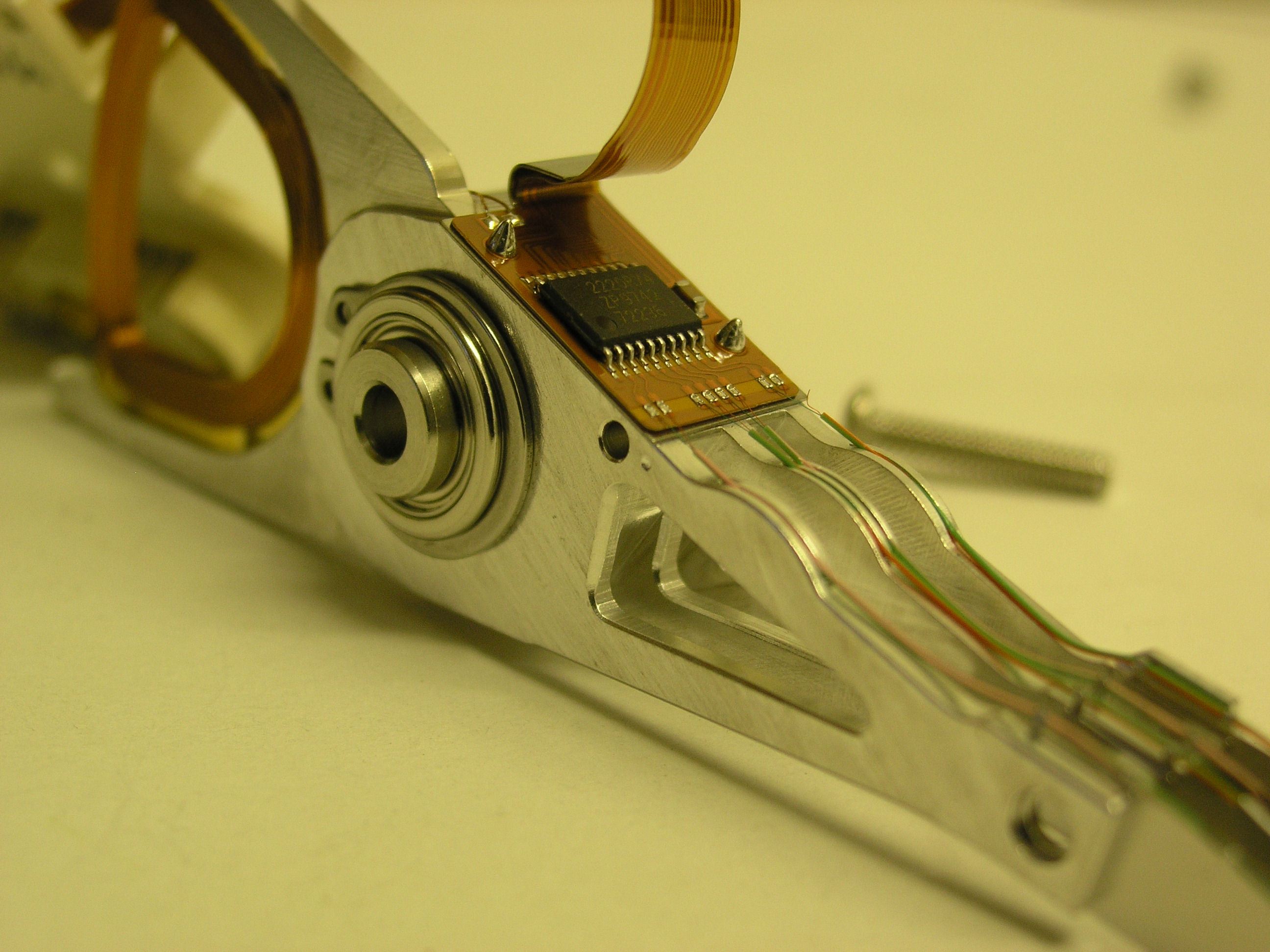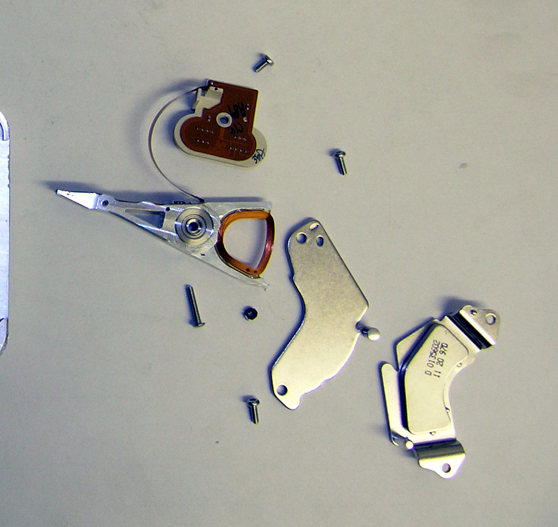 The head assembly consisted of an arm that rotated about a bearing between the read/write heads (left),