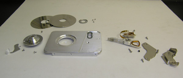 Here is the disk drive taken to bits. On the left is the disks, on the right the head assembly.