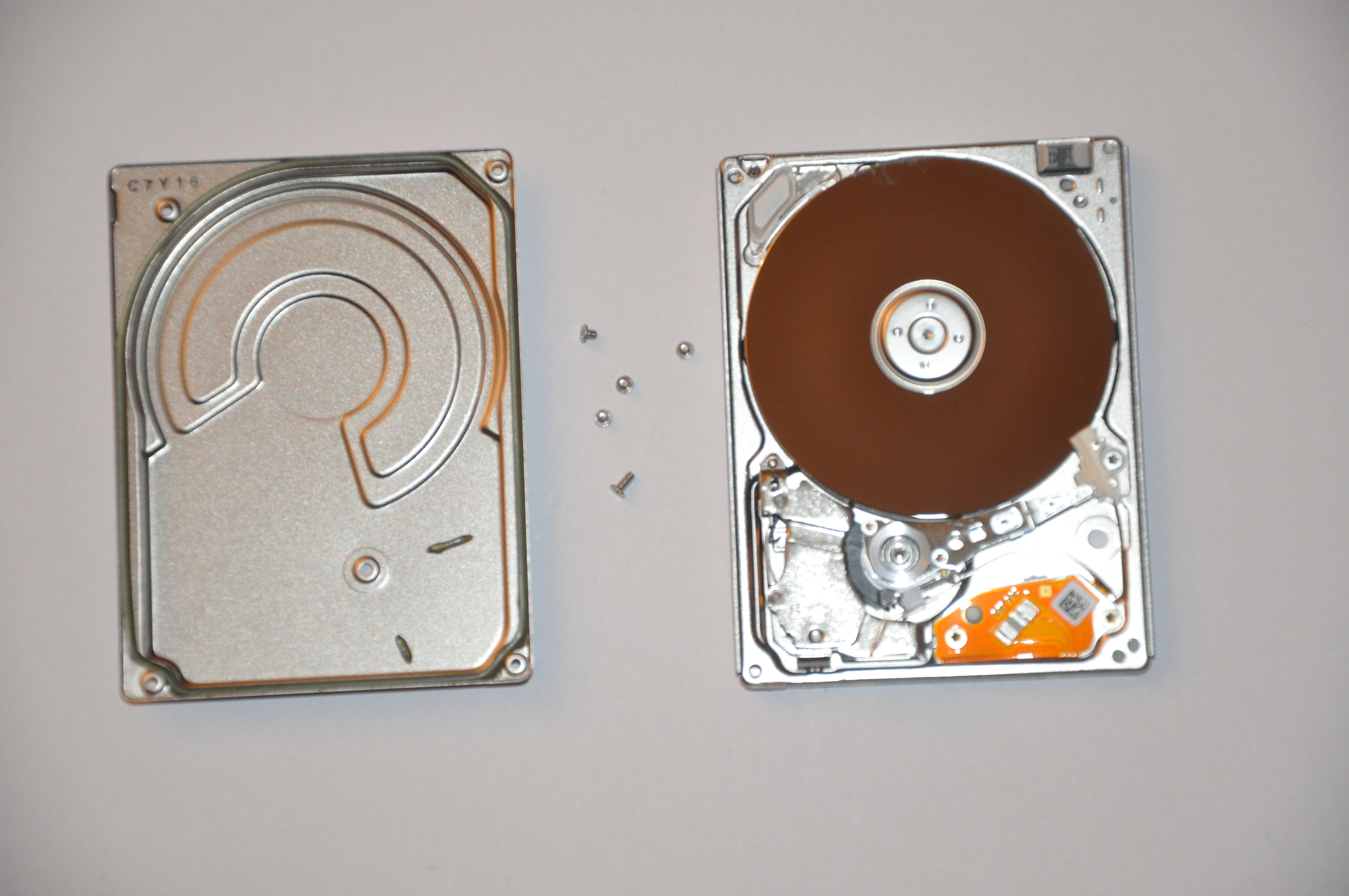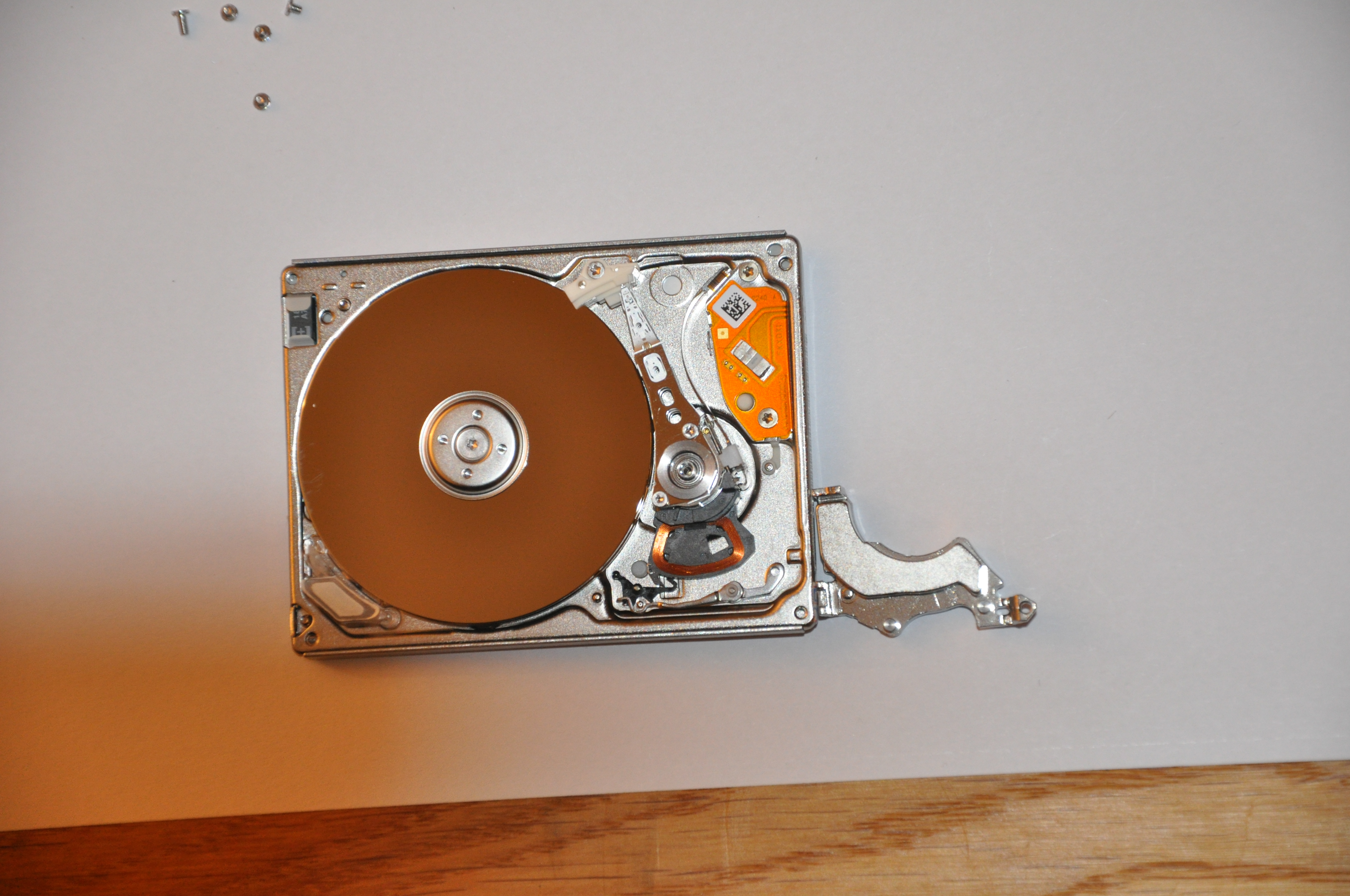 There are two disk platters and four heads. Here they are parked off the disk surface.