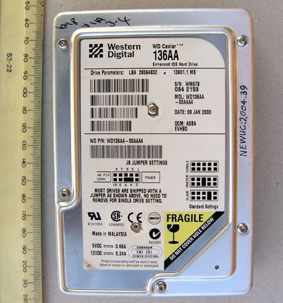 | Mus.Cat. NEWUC:2004.39 | Mnfctr: Western Digital | Date: 09 JAN 2000 | Ser. No: WM678 084 2153 | Model: WD Caviar 136AA |