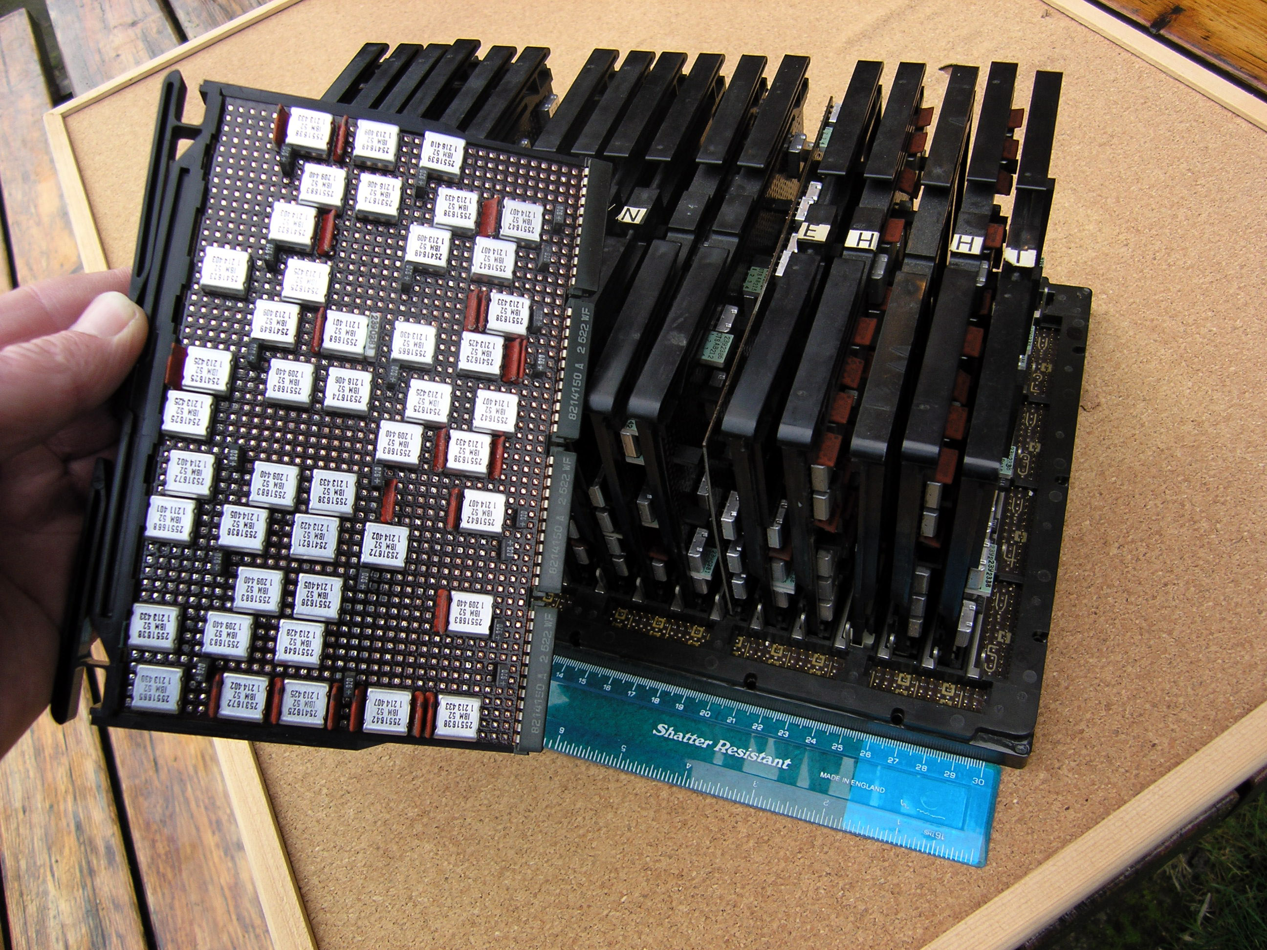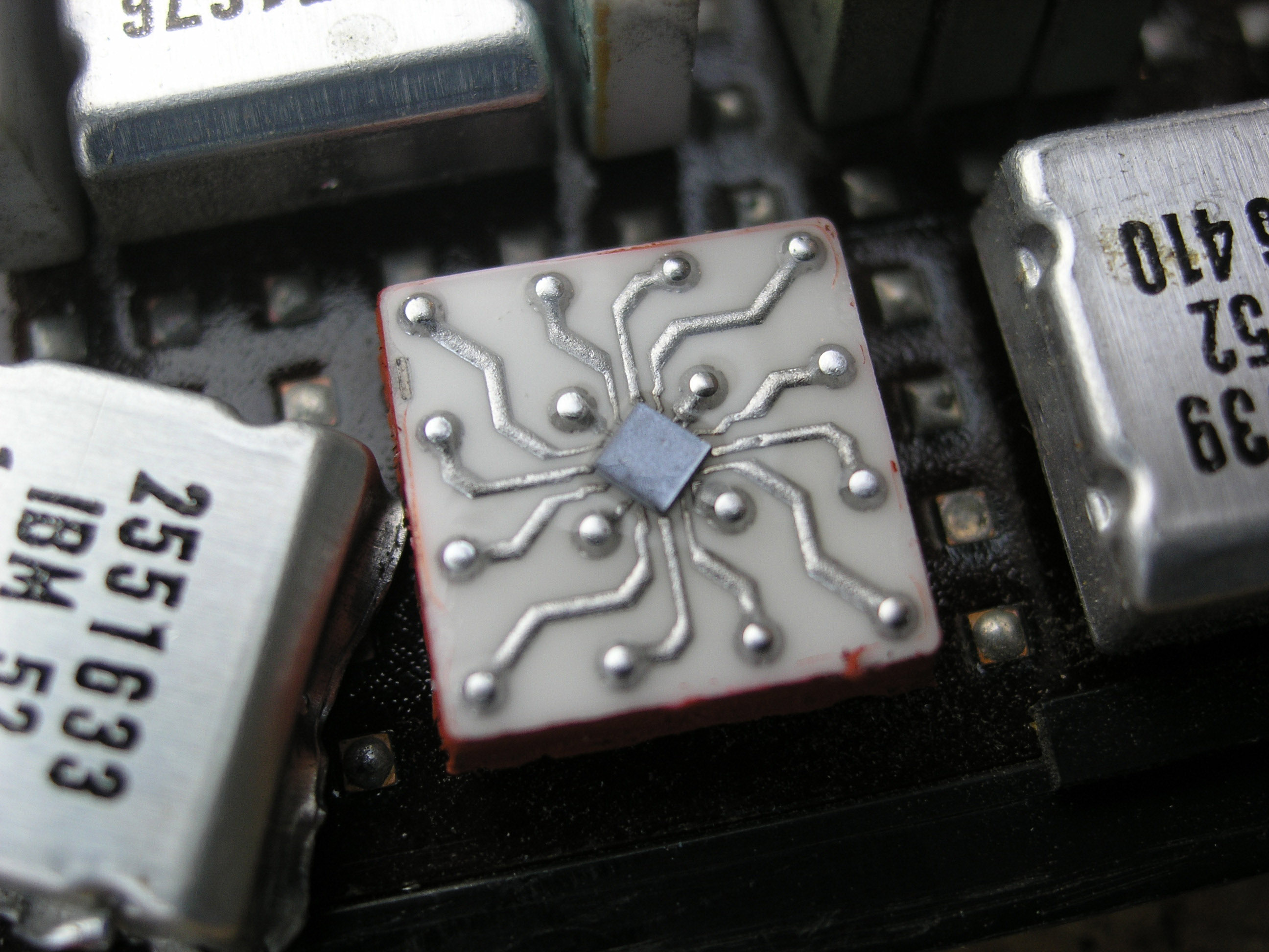Here you can see 16 conductors to a chip, more than the just three to a 360 transistor chip.
