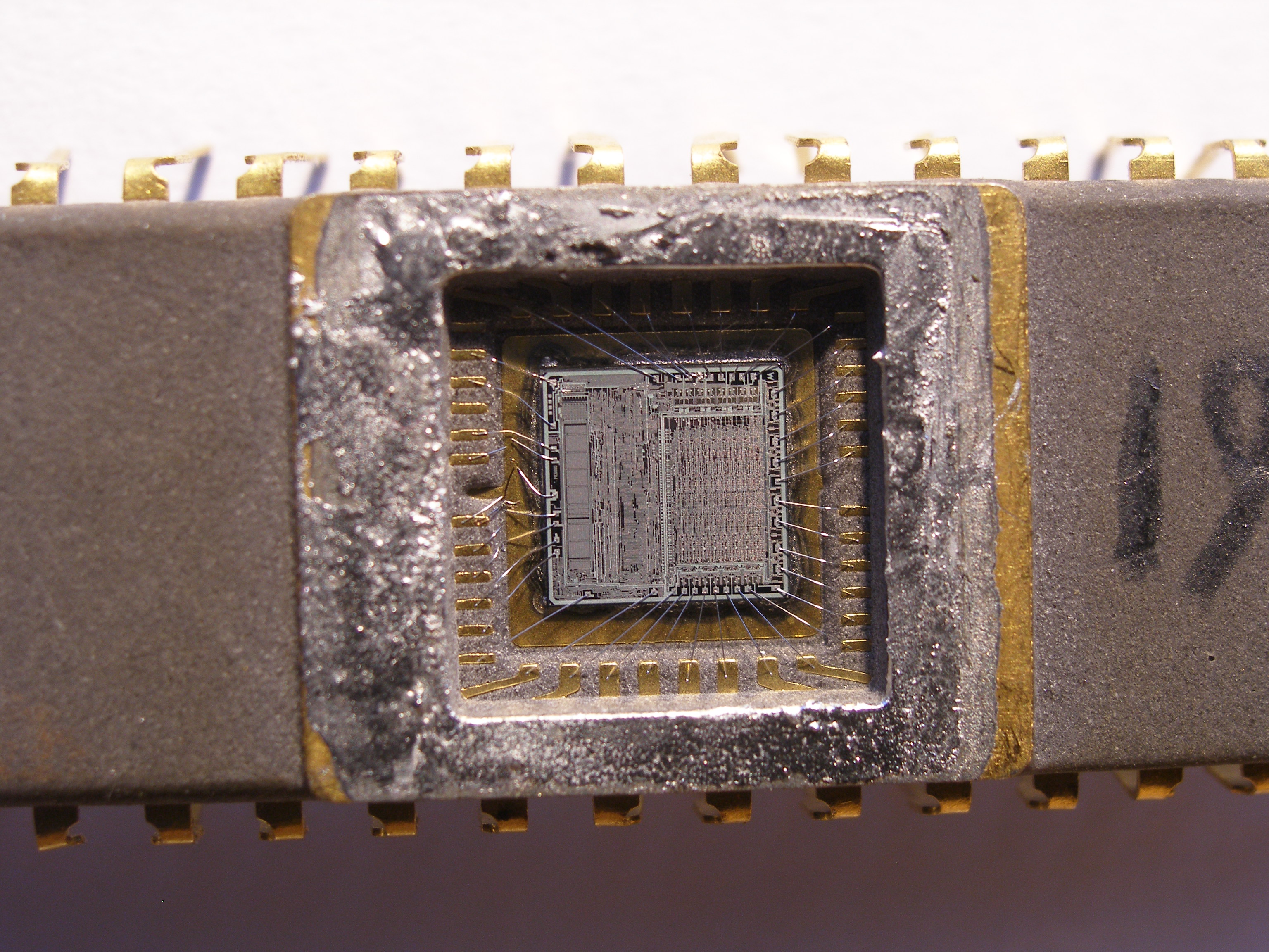 Unlike the previous VLSI microprocessor we know quite a lot about this one because we found the 32 page DATA SHEET for it on the WEB at www.alldatasheet.com. The 40 pin ceramic package containing the silicon chip is 50mm long and weighs just 4 gram. The actual chip is just 8 x 6 mm, exposed when I unsoldered the cover protecting it. It is a complete CPU just like the AMDAHL stack which weighs about 100,000 gram,