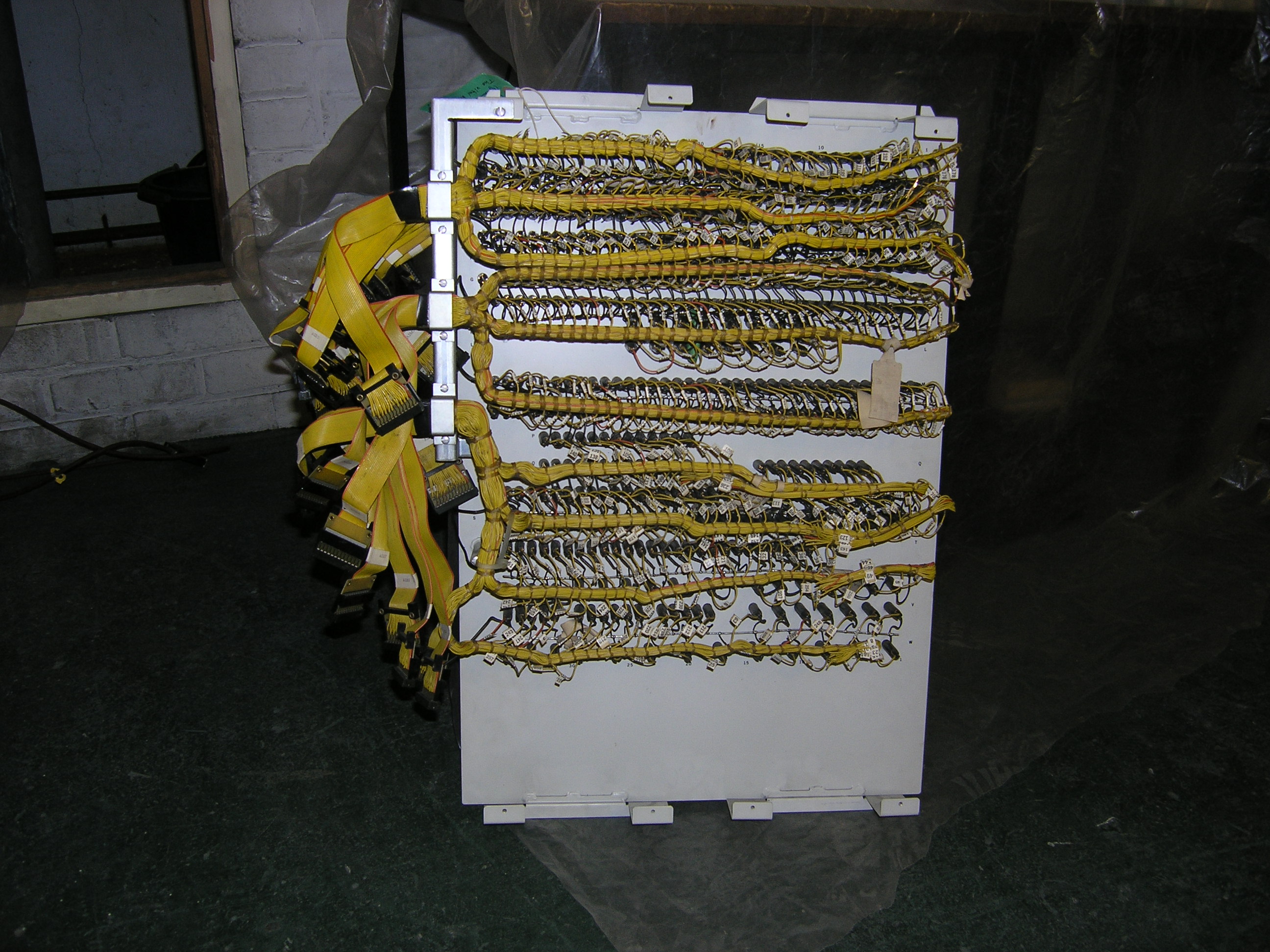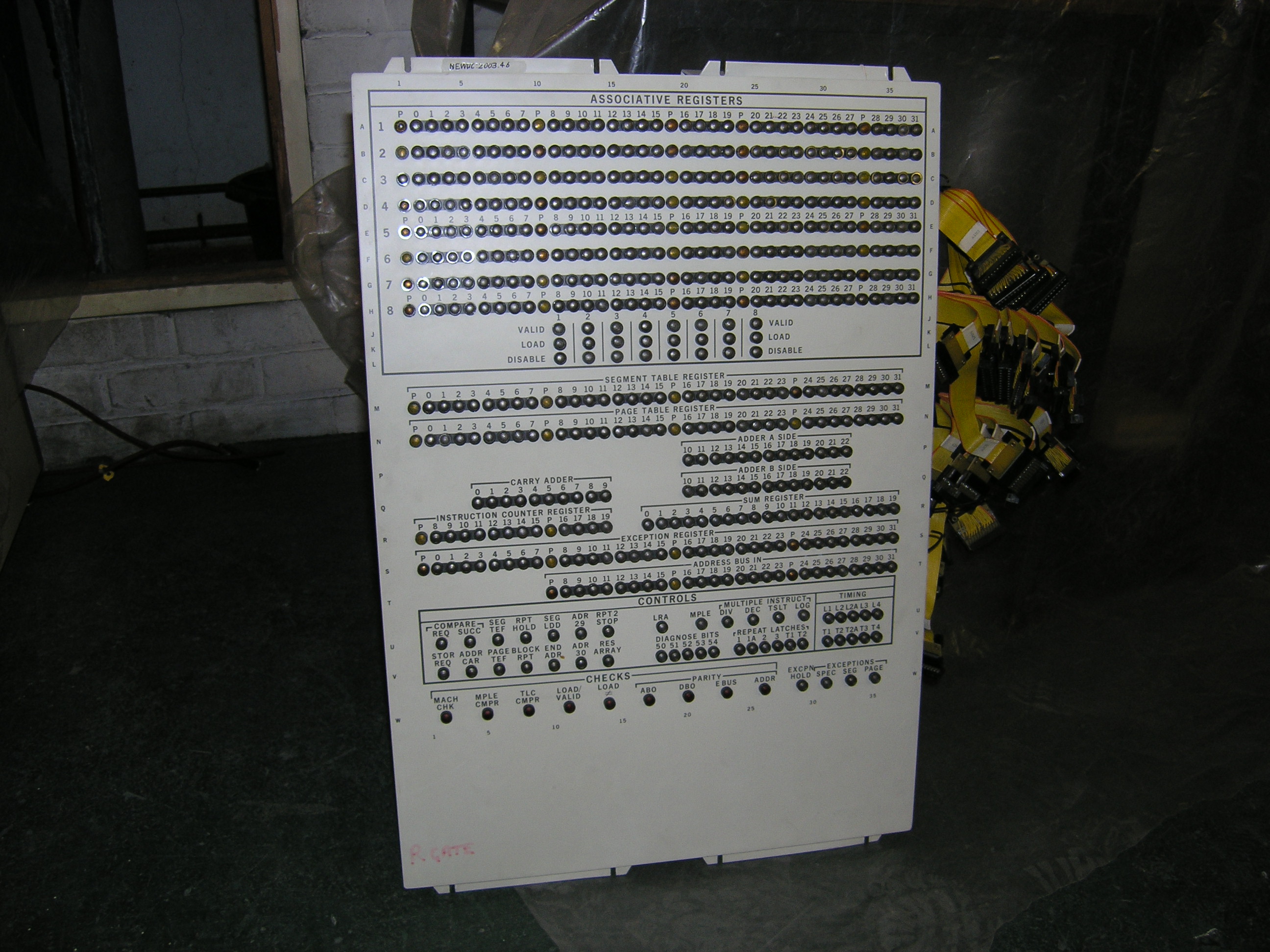 This is the display panel from the DAT box (Dynamic Address Translation unit). This piece of hardware along with a few exta CPU instructions transformed the 360 Model 65 computer to the 360 Model 67. The 360/67 computer supported Virtual Memory. Virtual Memory in these days is taken for granted you do not even know you are using it. But, in those days it was revolutionary. Before this time people who used computers submitted their programs and data on paper tape or punch cards to computer operators then went away, returning hours later or next day to get the results. About this time the idea arose that people could interact directly with a computer via a typewriter like device called a 'terminal', and run their programs interactively. To do this their program and data had to be in RAM (Random Access Memory) which was very expensive. But interactive users made wildly different demands of the computer, at one moment initiating a compilation of their latest program that required much of the CPU and RAM, then when the program error messages were printed they would make no demands of the computer, and the telephone might ring or they would make a cup of tea. So their program and data were not needed in RAM In addition to the users intermittent demand for the computer's resources the programs being run use RAM in many different ways. The main computation loops get exercised a lot, whilst initialisation, termination and error code perhaps little. To address these different usages of the computer resources virtual memory was invented. The 24bit address of the computer could address 16MByte but the actual RAM was less (1MByte). The virtual memory was on an external device. Both it and RAM was formatted in 2KByte pages. Programs were written as if in virtual memory and stored as such on the external device when loaded. When the program began execution pages from the device were read and allocated to pages in RAM and page tables (in RAM) updated to record the real address of each virtual address page. As the program was executed instructions were fetched to be executed by the CPU that contained virtual addresses. These had to be translated to real addresses and that could involve access to the page tables in RAM. This would really slow the computer down since the speed of a computer is governed by the speed of its RAM. This is where the DAT box came into play. It had eight ASSOCIATIVE REGISTERS that contained the last eight page table translations. As a program executed it was highly likely that the next instruction or item of data was on the same page. When a virtual address translation began a hardware lookup was made via the DAT box and if the real page address was in a register no access was required to the page tables and the CPU could proceed unimpeded. A translation rate in the high 90% via the DAT box meant VM (Virtual Memory) became a practical reality. If you want the full grizzly details they can be found in: http://en.wikipedia.org/wiki/IBM_System/360_Model_67
