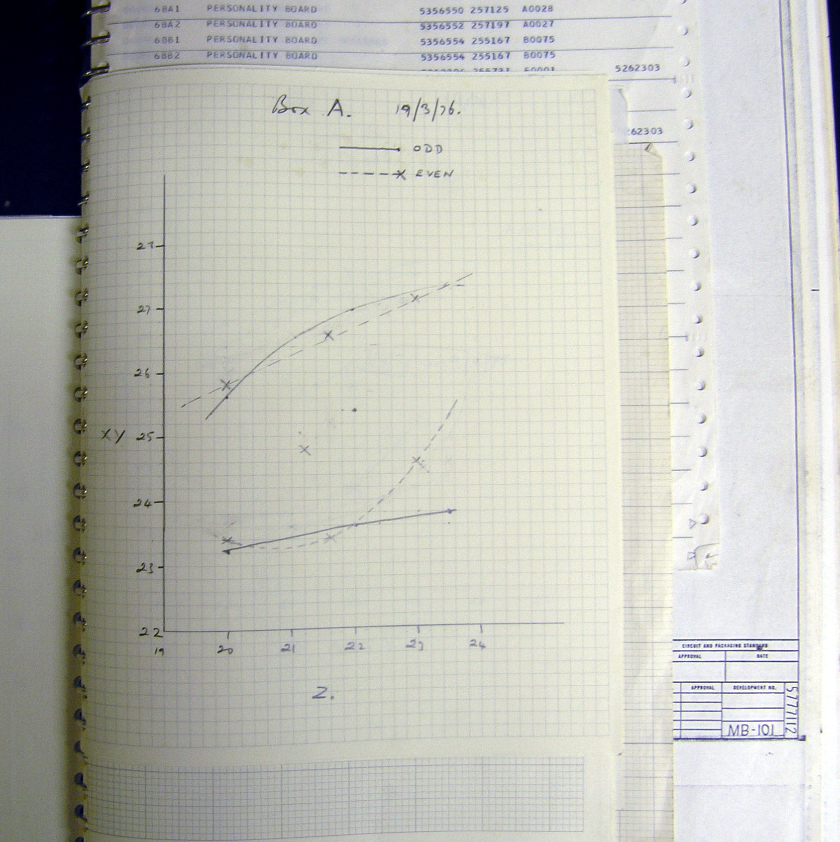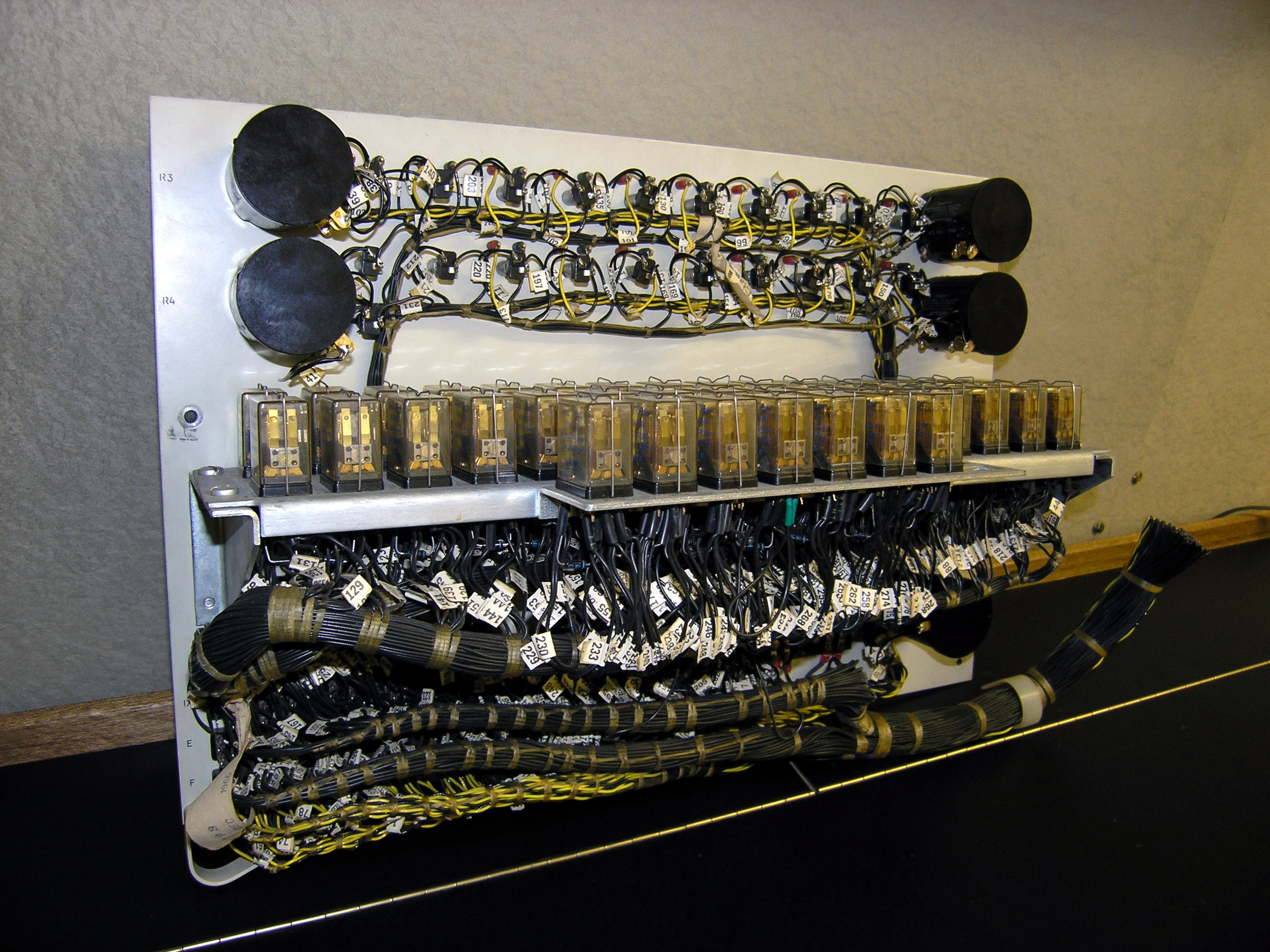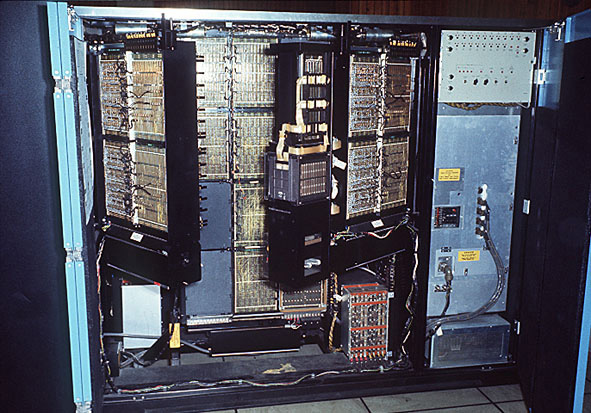 This is a photograph of a core storage cabinet. It contained 256KBytes. There is more about it at 360 Core Storage. Our interest here is the rectangular white panel at the top right. We still have it! Just in passing, below it is power supplies, to the left of that two gates opened each containing 64KBytes of core storage, there were two more gates on the other side. In between was a central fixed gate containing circuitry common to all four gates.