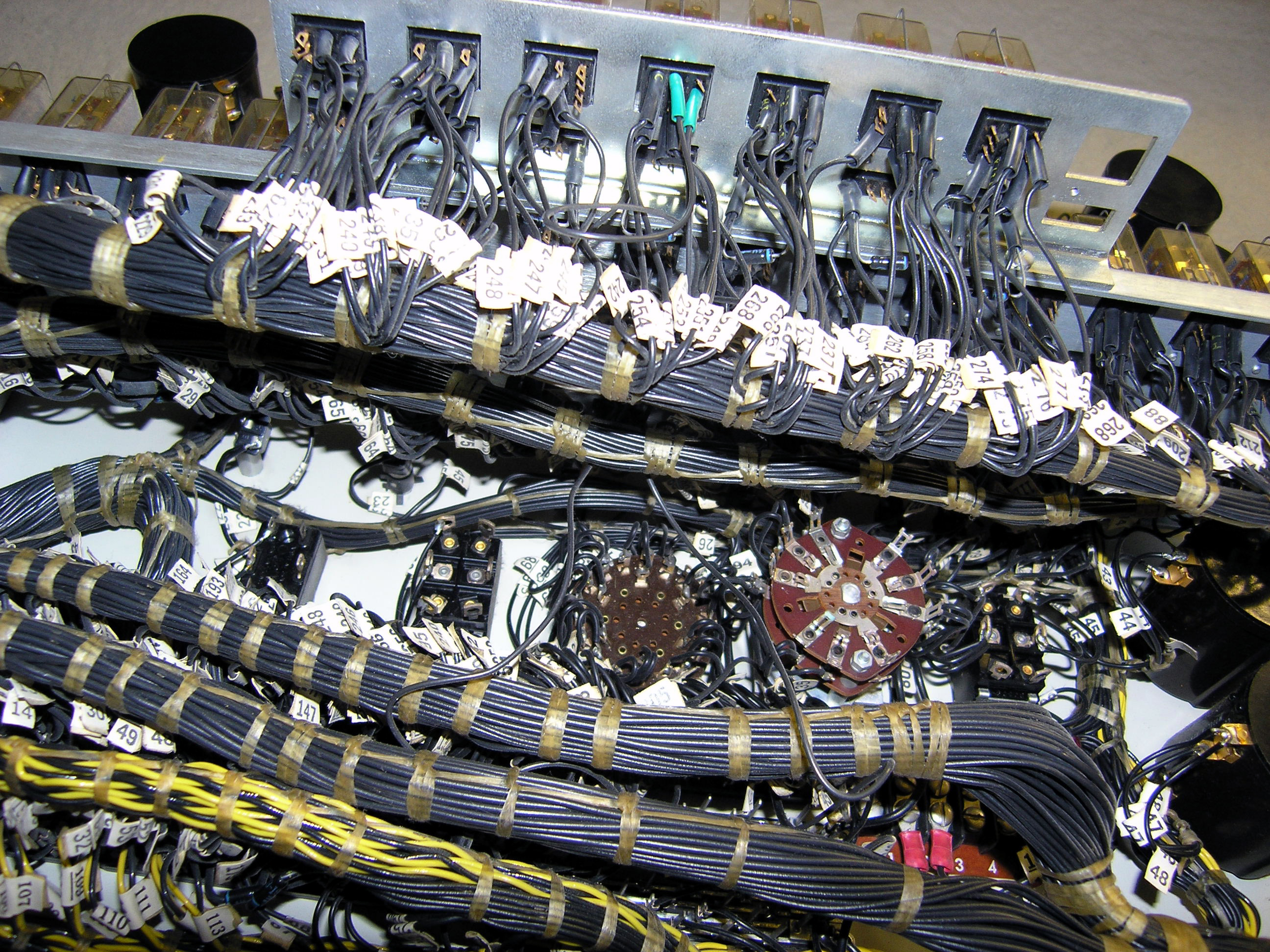 This is the panel. It displayed the state of 25 power supplies, power and high temperature indicators, and six rheostats for adjusting the voltages of the core storage modules. This is the rear of the panel. At the top is two rows of indicators for the 25 power supplies Below that is two rows of reed relays that controlled the seqence of powering on of supplies, and below that a mass of wires. Here is that mass of wires. Go to Closeup to see the detail of the hand work involved in the construction of just this panel let alone the core storage gates. One of the routine maintenance of the System 360/67 was to schmoo the three wire core storage memory. This involved varying the voltage of the "x" "y" and "z" wires to find a sweet spot. In this plot there is two plots a "." and an "X" plot. I do not know which came first, but enough to know that the core store needed tuning over time |