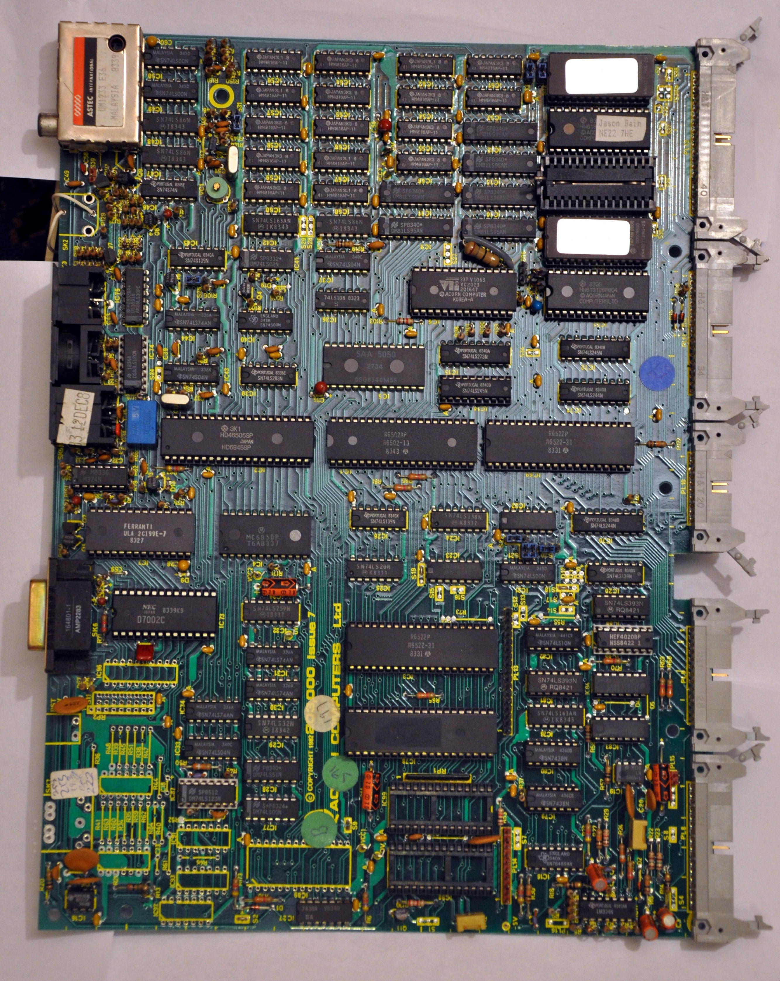The middle 40 pin integrated circuit is labelled R6502-13, it is a Rockwell 1MHz 8bit microprocessor.