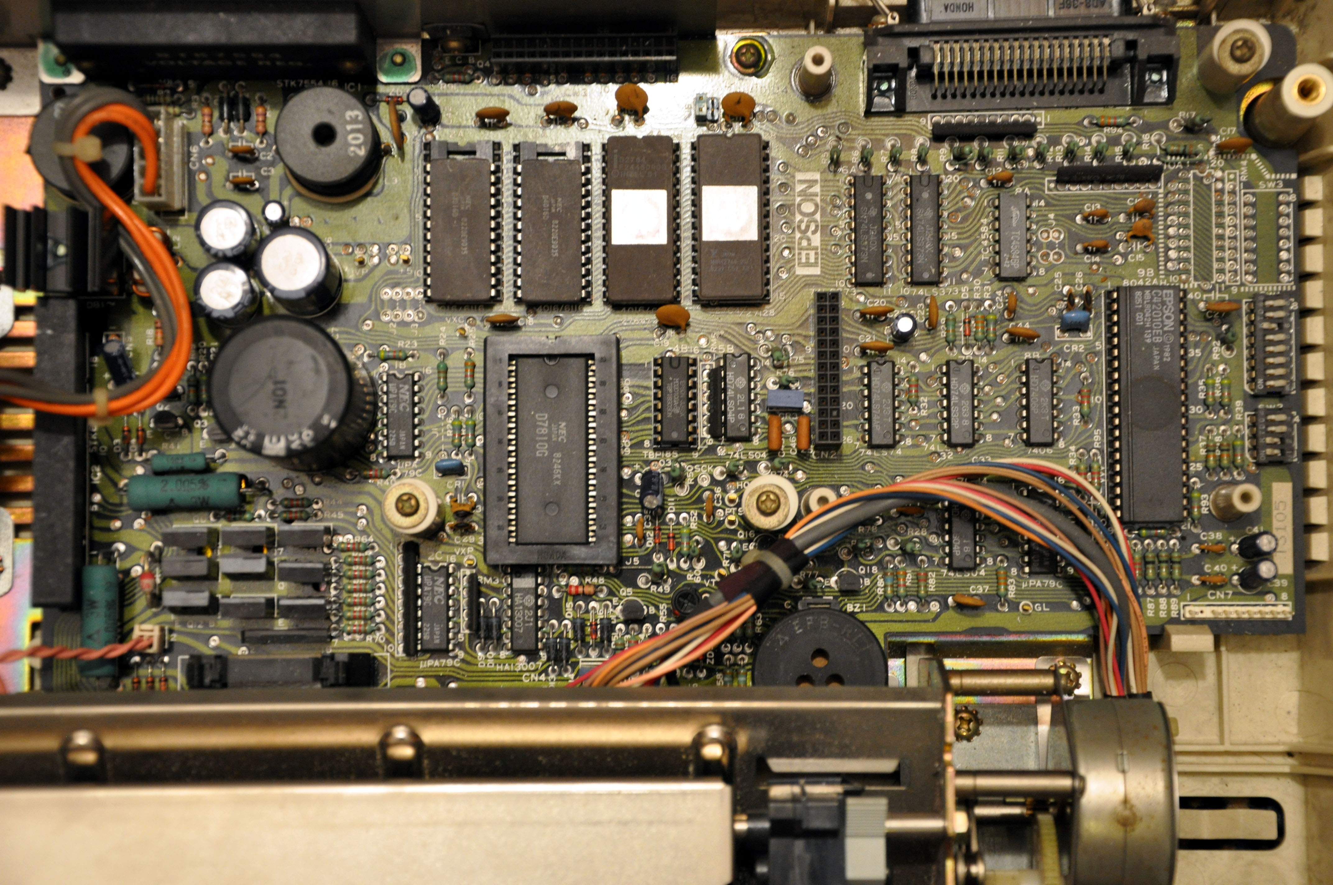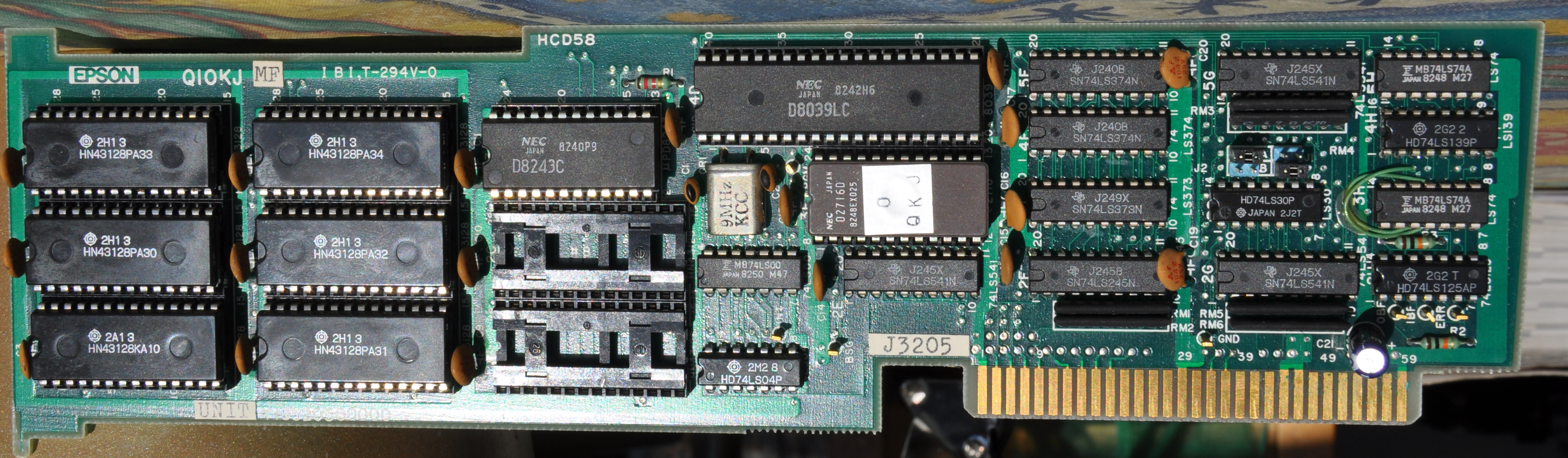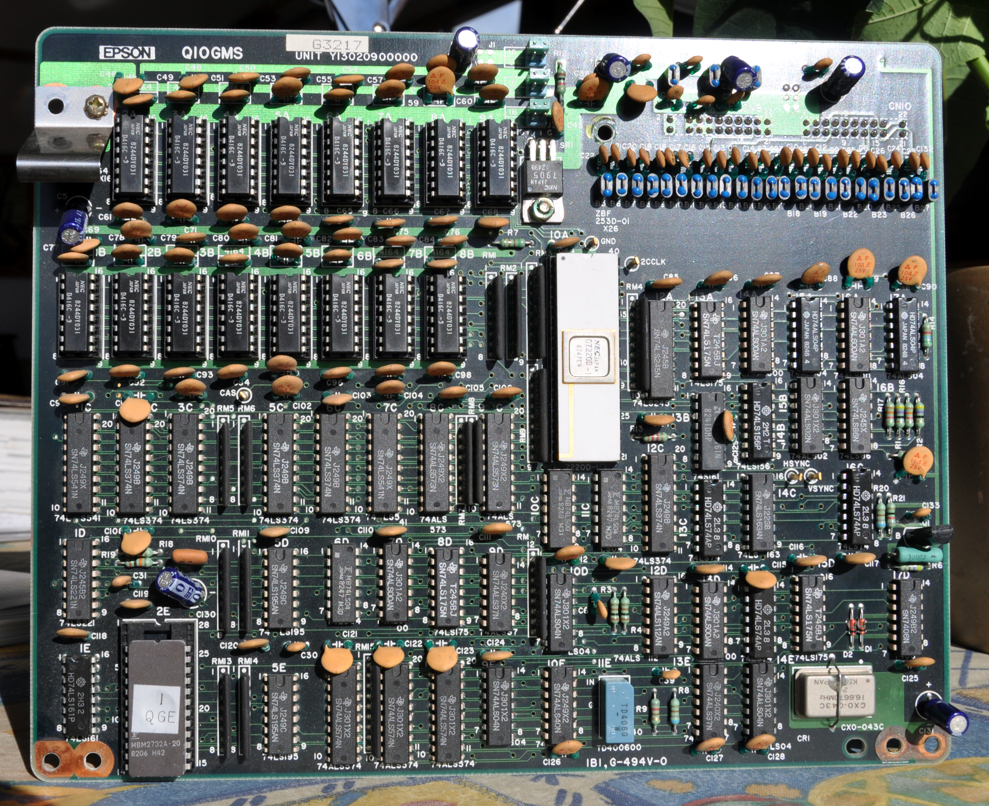 This is the processor box opened up. ![]() On the right are two 5¼:" 340 KByte floppy disk drives.   ![]() This is the Mother Board. To the lower right is three 40 pin chips. The leftmost is a D780C-1 chip. This is the 4MHz Z80 CPU. To the right of it are two D8237AC-5 chips, they are HIGH PERFORMANCE PROGRAMMABLE DMA CONTROLLERS. (DMA - Direct Memory Access.) To the left a bit above is D765AC chip. GOOGLING it gives "Single/Double Density Floppy-Disk Controllers". Top left is three blocks of 8 brown 16 pin HN4864p-2 chips labelled BANK1, BANK2 and BANK3. Googling "HN4864P-2" gives 65536 x 1-Bit DRAM. (DRAM is an acronym of Dynamic Random Access Memory.) So each Bank is 64KByte of RAM, totalling 192KByte.   ![]() This is the daughter board. The big chip D7220-1 is a High-Performance Graphics Display Controller. The two columns of eight 16pin D416C chips above left are 16K x 1, Page Mode Dynamic RAM. So that is 32KByte of fast Random Access Memory to supply the image on the moniter.   ![]() This is the card from the expansion slot. It has got a 24 pin DIM chip D2716D which is 16K UV Erasable PROM, but found nothing about the other DIMs. I am guessing the 40 pin DIM is a microprocessor. Then I found a Yet another computer museum which has a photograph of the same expansion card. The QX-10 has a MultiFont functionality via this expansion card.   ![]() The power supply.   ![]() The keyboard in bits, lots of bits.   ![]() Keyboard.   ![]() Inside the monitor. It is a Cathode Ray Tube which inside is a vacuum with an electron gun at the narrow end on the right to a flourescent screen on the left controlling the electron beam to scan horizontally and then vertically to produce a raster image.   ![]() The other side. There are a lot of bits and pieces connected by wires, cost a fair amount to make.   ![]() The inside of the EPSON FX80 DOT MATRIX PRINTER.   ![]()   |