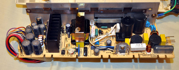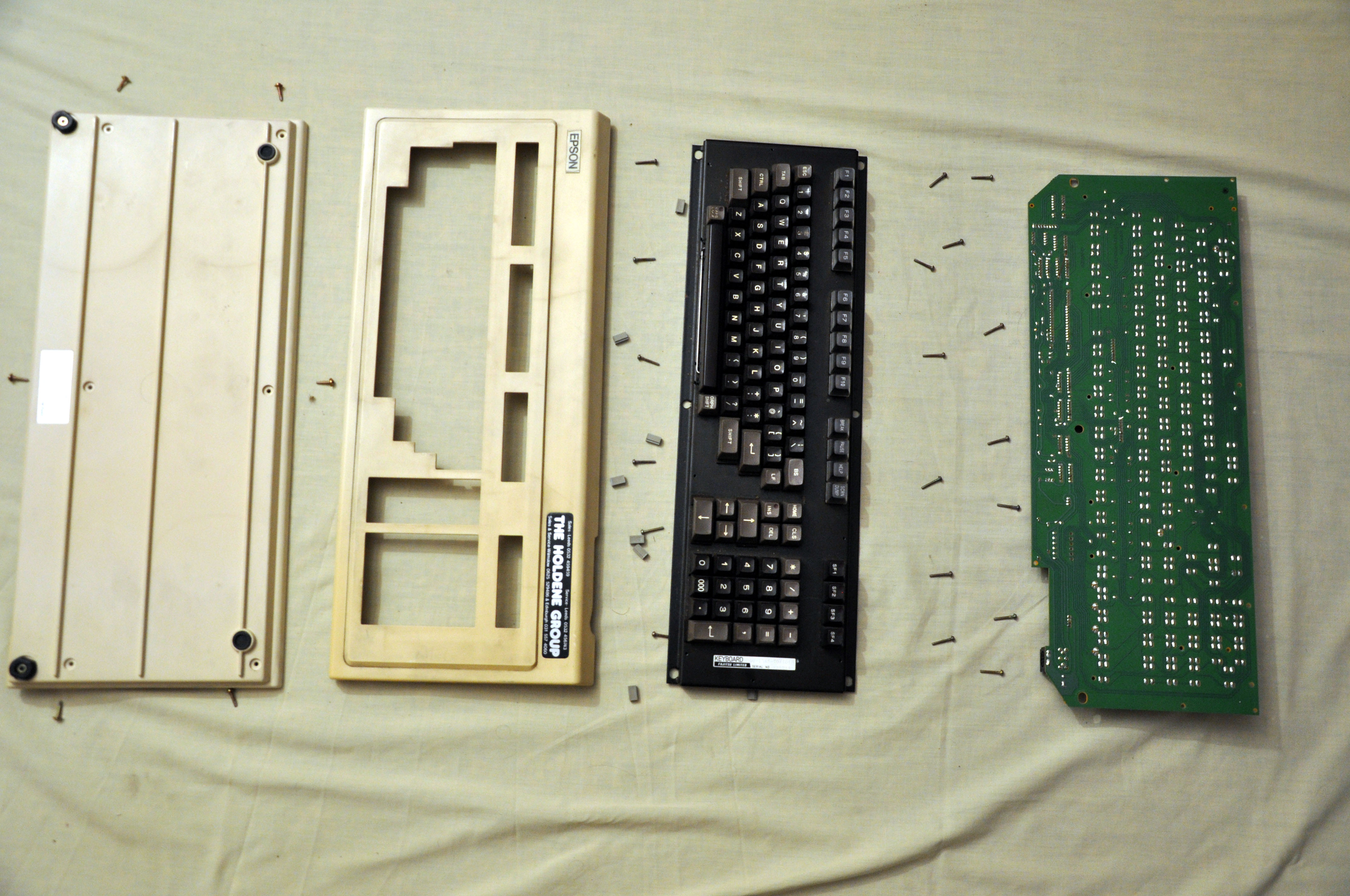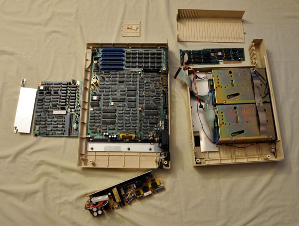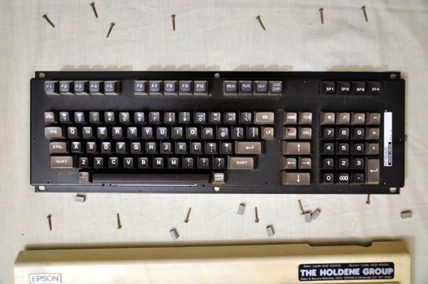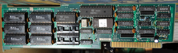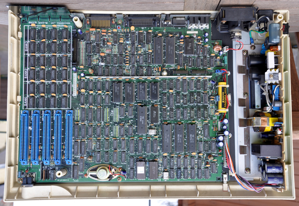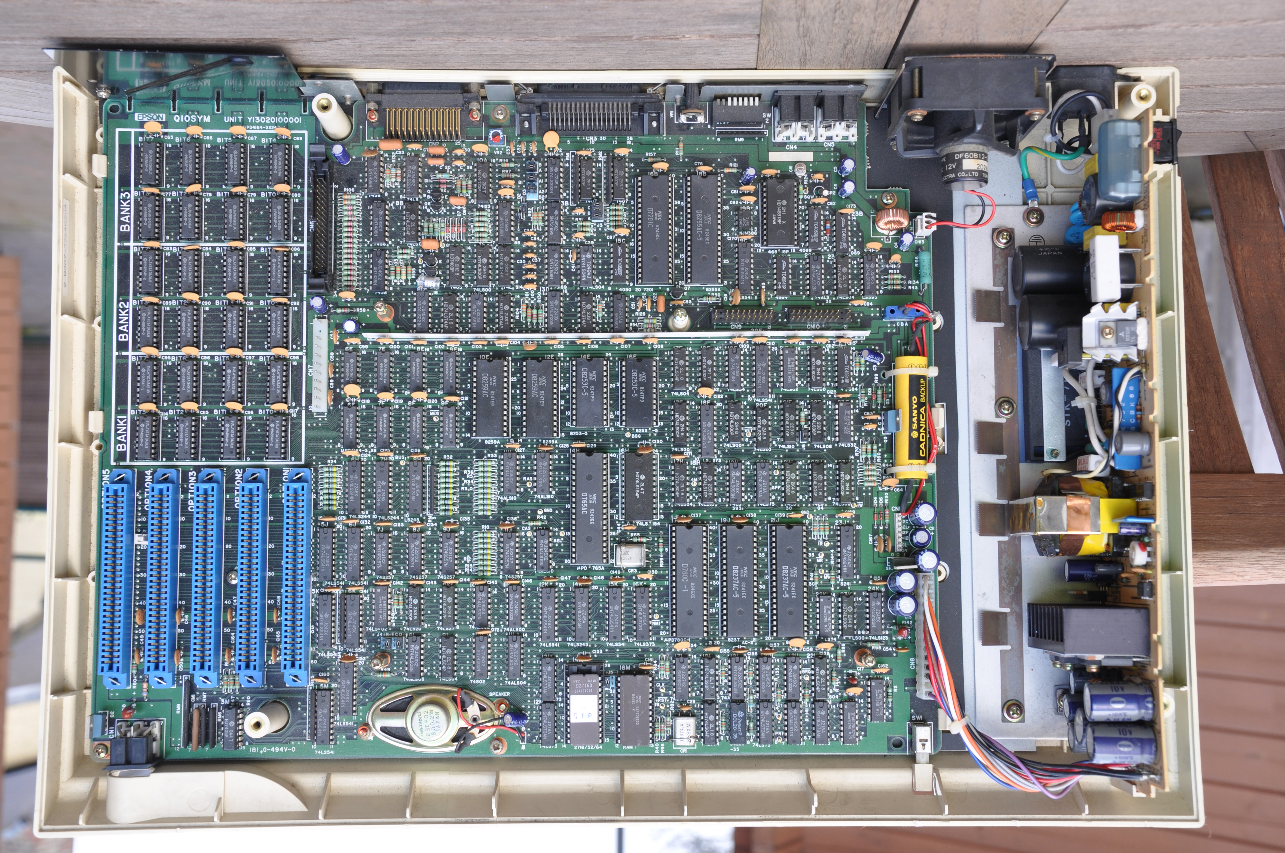 This is the processor box opened up. ![]() On the right are two 5¼:" 340 KByte floppy disk drives.   ![]() This is the Mother Board. To the lower right is three 40 pin chips. The leftmost is a D780C-1 chip. This is the 4MHz Z80 CPU. To the right of it are two D8237AC-5 chips, they are HIGH PERFORMANCE PROGRAMMABLE DMA CONTROLLERS. (DMA - Direct Memory Access.) To the left a bit above is D765AC chip. GOOGLING it gives "Single/Double Density Floppy-Disk Controllers". Top left is three blocks of 8 brown 16 pin HN4864p-2 chips labelled BANK1, BANK2 and BANK3. Googling "HN4864P-2" gives 65536 x 1-Bit DRAM. (DRAM is an acronym of Dynamic Random Access Memory.) So each Bank is 64KByte of RAM, totalling 192KByte.   ![]() This is the daughter board. The big chip D7220-1 is a High-Performance Graphics Display Controller. The two columns of eight 16pin D416C chips above left are 16K x 1, Page Mode Dynamic RAM. So that is 32KByte of fast Random Access Memory to supply the image on the moniter.   ![]() This is the card from the expansion slot. It has got a 24 pin DIM chip D2716D which is 16K UV Erasable PROM, but found nothing about the other DIMs. I am guessing the 40 pin DIM is a microprocessor. Then I found a Yet another computer museum which has a photograph of the same expansion card. The QX-10 has a MultiFont functionality via this expansion card.   ![]() The power supply.   ![]() The keyboard in bits, lots of bits.   ![]() Keyboard.   ![]() Inside the monitor. It is a Cathode Ray Tube which inside is a vacuum with an electron gun at the narrow end on the right to a flourescent screen on the left controlling the electron beam to scan horizontally and then vertically to produce a raster image.   ![]() The other side. There are a lot of bits and pieces connected by wires, cost a fair amount to make.   ![]() The inside of the EPSON FX80 DOT MATRIX PRINTER.   ![]()   |