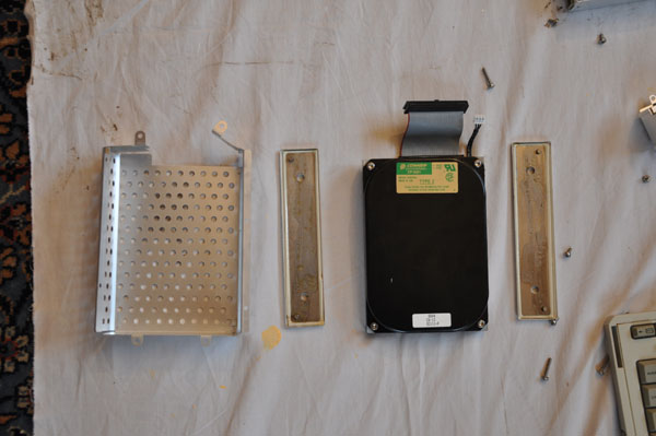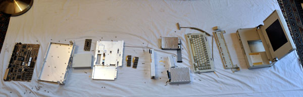 Disassembled, outer case on right, then keyboard, then floppy disk and hard disk drive,