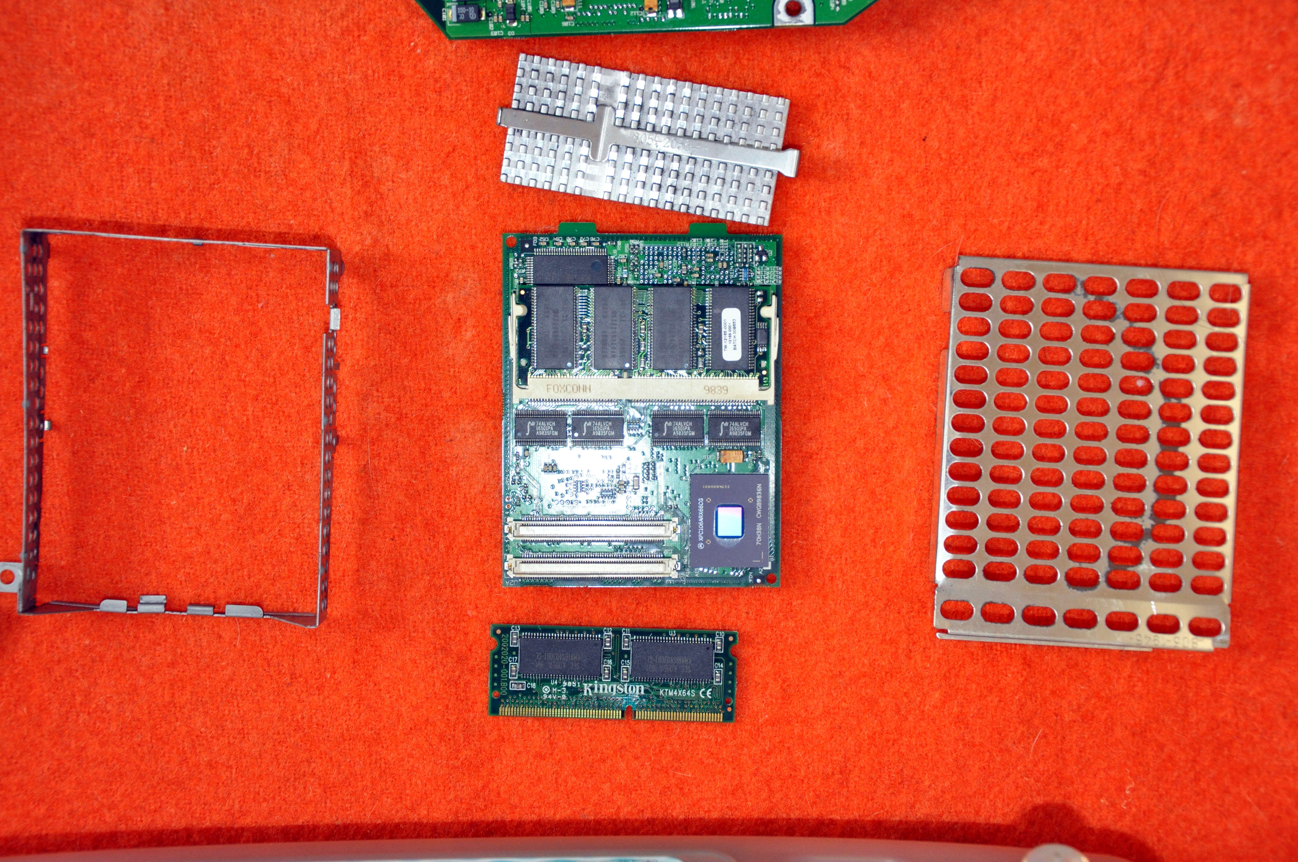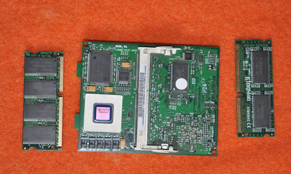 ![]() This is the daughter board containing CPU and the 32MByte RAM on a DIMM chip. The heat sink above clipped on to the frame around the daughter board.   |