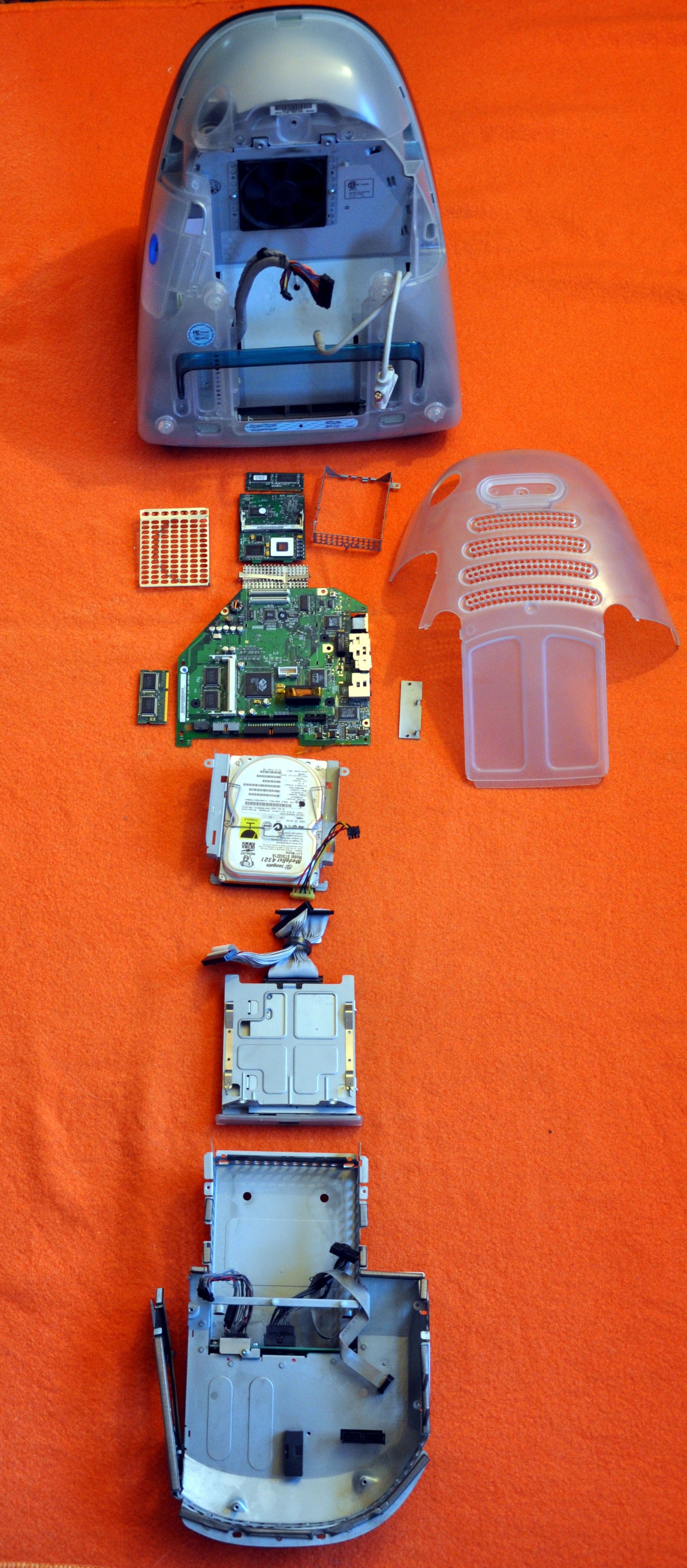 This is an iMac G3 opened up.   Just three screws released the base plate on the below right.   Then four screws released the base unit at the bottom. More screws released the compact disk drive,   then the hard disk drive andthe mother board.