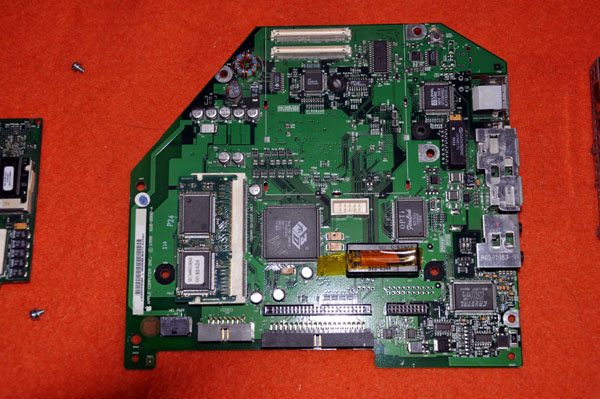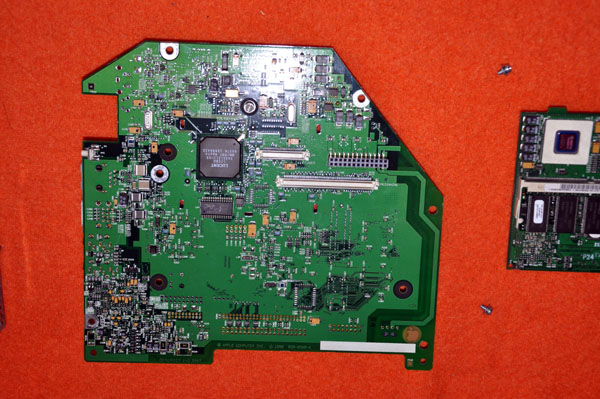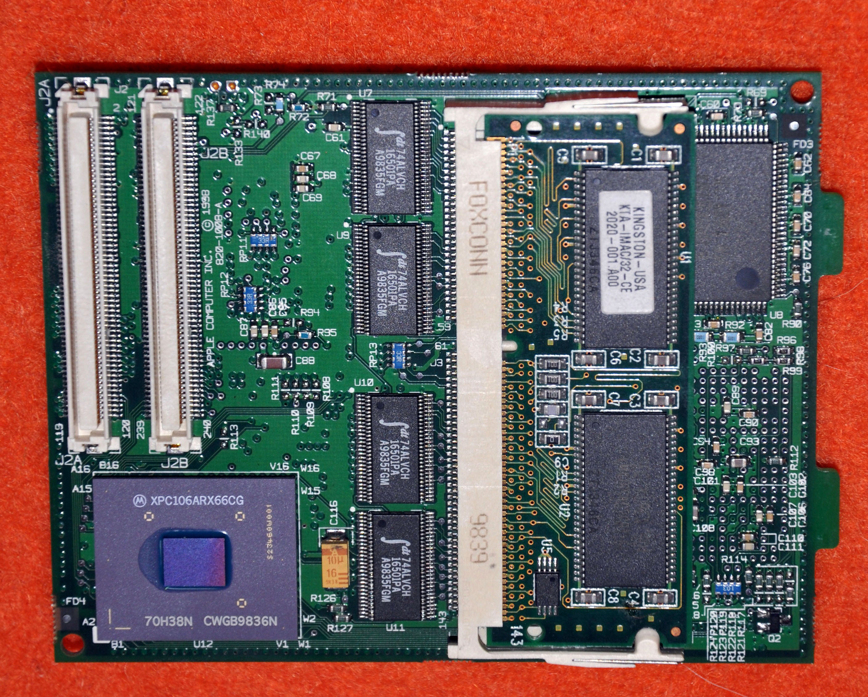 ![]() This is a closer view of the daughter board. The big chip bottom left labelled XPX106ARX66CG is a Motorolla 350MHz Power PC 750 CPU.   |