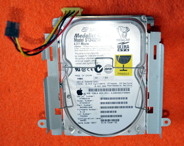 ![]() Next to remove was the hard disk drive, a Seagate Model ST34321A 4,311Mbytes. (That is 4.311GBytes) .   |