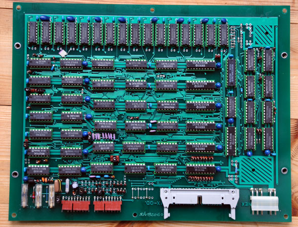A closer view of the motherboard. On the left is an array of 4 rows of 8 chips, this